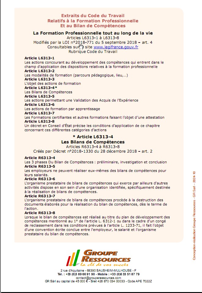 Article L6313-1 à L6313-8 et modifiés par la loi n°2018-771 du 5 septembre 2018- entre dans le champ de la formation professionnelle continue tout au long de la vie comme une action et permet d’analyser ses compétences professionnelles et personnelles, ses aptitudes et ses motivations en appui d’un projet d’évolution professionnel et de formation